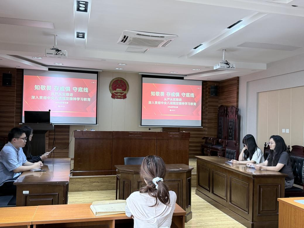 为深入贯彻习近平总书记关于加强党的作风建设的重要论述,深入贯彻中央八项规定精神学习教育,充分发挥法学专业优势,强化党员干部廉洁自律意识,2025年6月5日,本科法学党支部于J01417开展模拟法庭庭审实践活动。