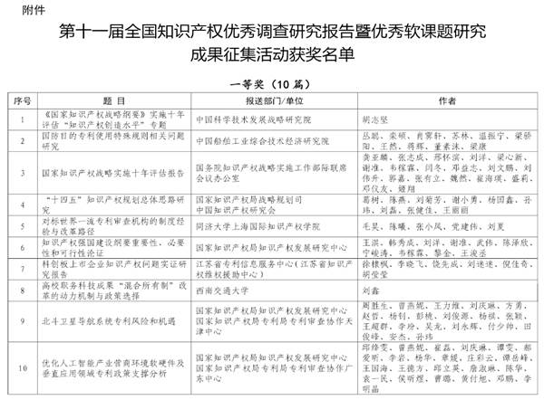It is reported that the 11th National Intellectual Property Excellent Investigation and Research Report and outstanding Soft Research Achievement collection activity was sponsored by the State Intellectual Property Office. 210 works were submitted nationwide. The works were appraising from relevant Ministries and commissions of the State Council, local intellectual property bureaus, universities and research institutes, etc. The contents of the works involved the improvement of intellectual property policies and systems, the construction of a strong country in intellectual property, the research on the 14th five-year Plan of intellectual property, and the research on international hot issues. According to the selection criteria and procedures, 45 winning works were selected by the experts and the selection committee, among which 10 won the first prize, 15 won the second prize and 20 won the third prize.