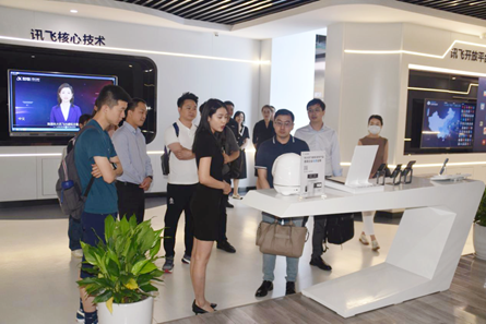 会前,科大讯飞公司智慧城市部市场部徐振兴副总裁陪同参观科大讯飞人工智能展示厅,详细讲解了讯飞核心技术与各行业赛道的产品应用情况。